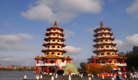 2) 연지담: 녹색의 호수와 거울 같은 호반에 띄워진 연지담은 가장 대만다운 풍경으로 잘 알려져 있다. 호반에는 용과 호랑이가 크게 입을 벌리고 있는 7층 '용호탑(龍虎塔)'과 4층 '춘추각(春秋閣)'이 제 각기 쌍을 이루어 호수의 아름다움을 두드러지게 하고 있다. 이 4개의 탑과 호수에 떠 있는 중국식 정자 오리정(五里亭)과 백의관음상,그리고 뒤에 솟아 있는 반병산의 그림자가 수면에 투영되는 모습은 한편의 풍경화라고 할 수 있다.